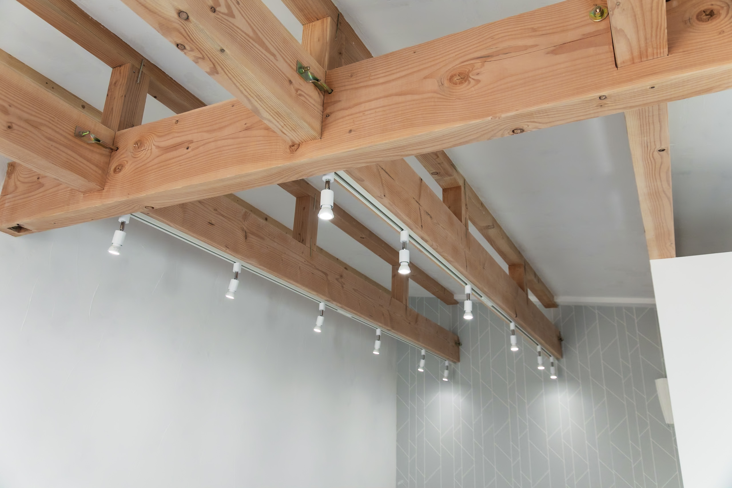 梁にあるダクトレール(ライティングレール)には、フリッカーレスで色温度5000K、CRIが98以上のLED光源を採用しております。
