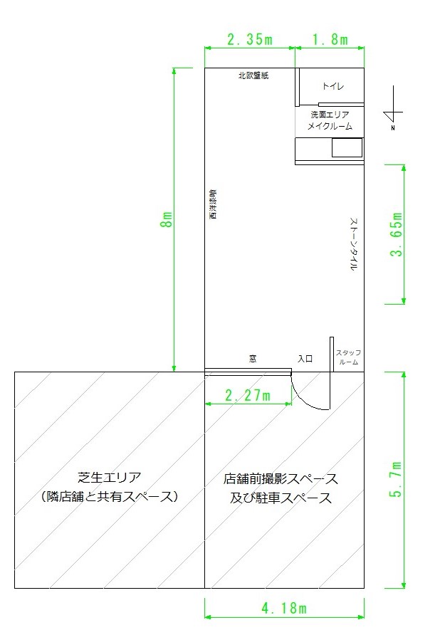 それぞれのエリアは、窓(幅2.27m)、西洋漆喰(幅8m)、北欧壁紙(幅2.35m)、ストーンタイル(幅3.65m)、造作洗面(幅1.8m)となっております。